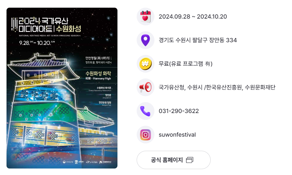 | 수원시 | 국가유산 미디어아트 수원화성 | 9.28.(토) ~ 10.20.(일) | 수원화성 일대 |